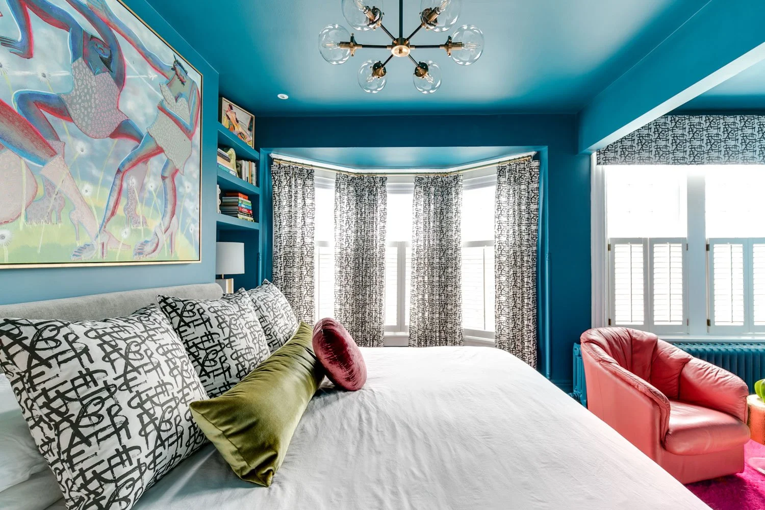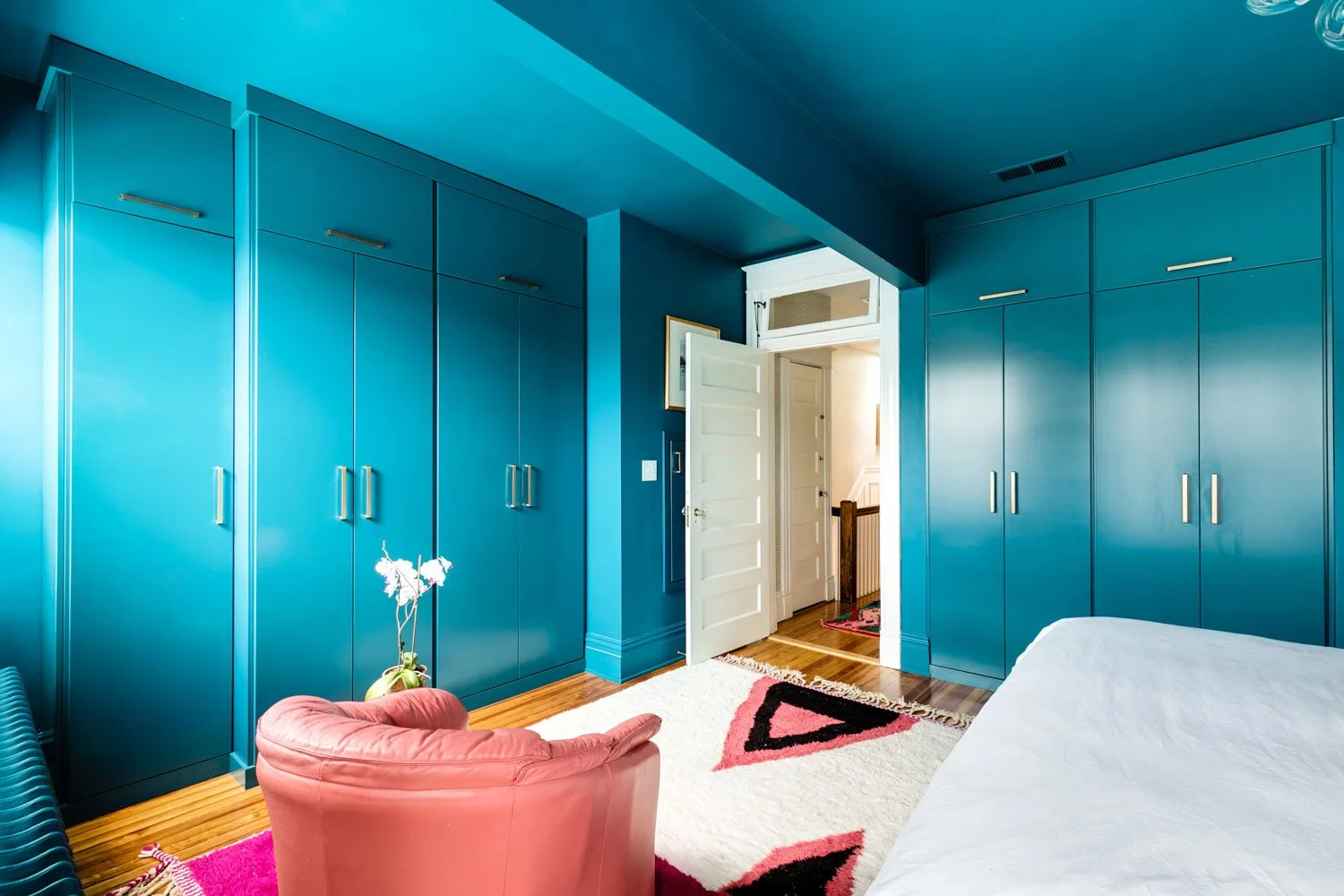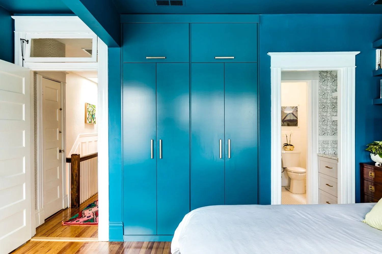 A previous homeowner had opened up the bedroom to the trunk room, but left columns which limited the placement of the bed to the inside of the bay window. A Richmond local artist has had to manage the long term effects of a traumatic brain injury and required a truly dark bedroom. The bed placement made opening and closing the blinds cumbersome, so they were always closed. At the same time, she is an artist who loves color. We opened up the wall a bit more, moved the entry door further down the hall, and incorporated the existing fireplace into built in bookshelves. As a result we were able to move the bed out of the bay window. We used a color from the painting she owned to create a space that is dark dreamy at night and bright and lively during the day.