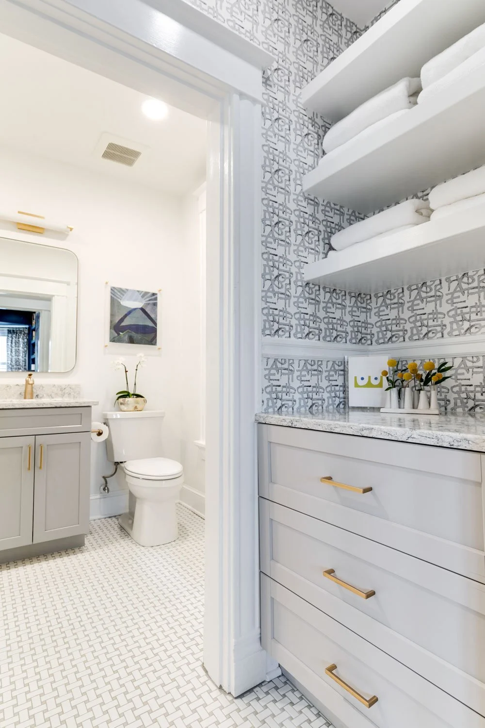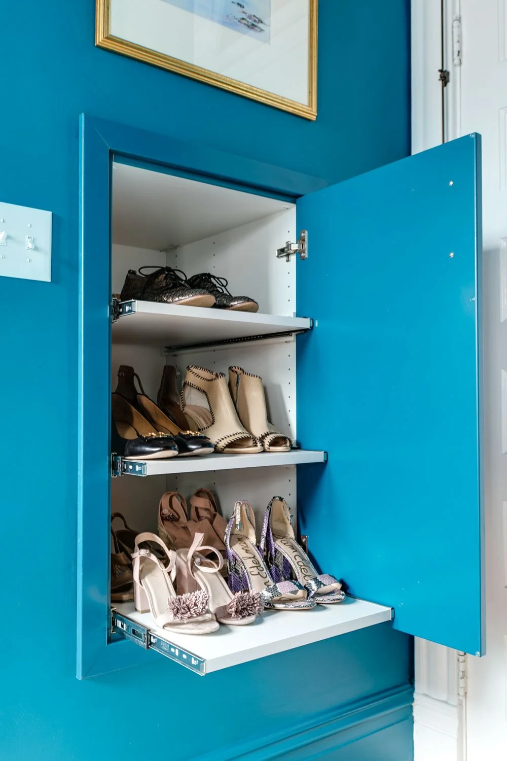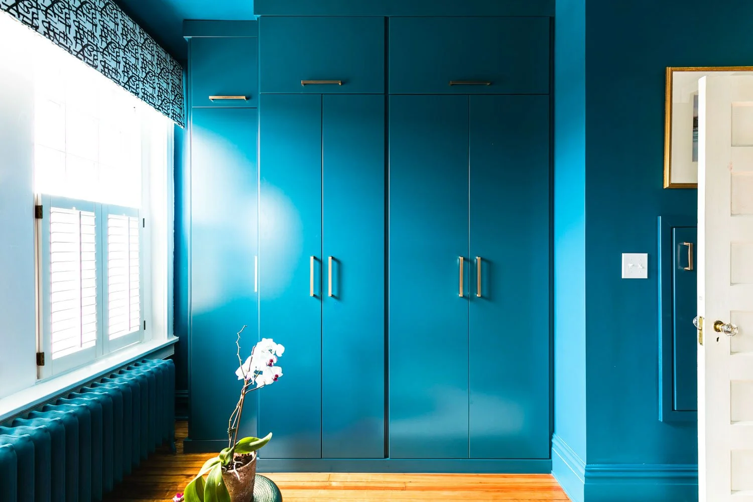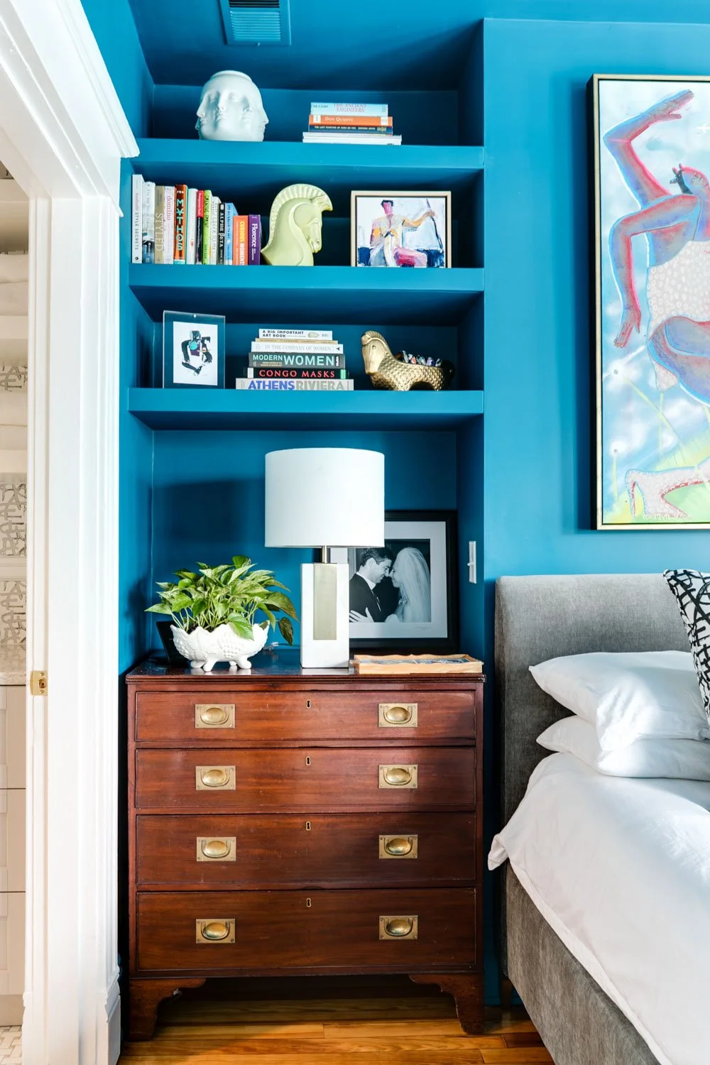 A previous homeowner had opened up the bedroom to the trunk room, but left columns which limited the placement of the bed to the inside of the bay window. A Richmond local artist has had to manage the long term effects of a traumatic brain injury and required a truly dark bedroom. The bed placement made opening and closing the blinds cumbersome, so they were always closed. At the same time, she is an artist who loves color. We opened up the wall a bit more, moved the entry door further down the hall, and incorporated the existing fireplace into built in bookshelves. As a result we were able to move the bed out of the bay window. We used a color from the painting she owned to create a space that is dark dreamy at night and bright and lively during the day.