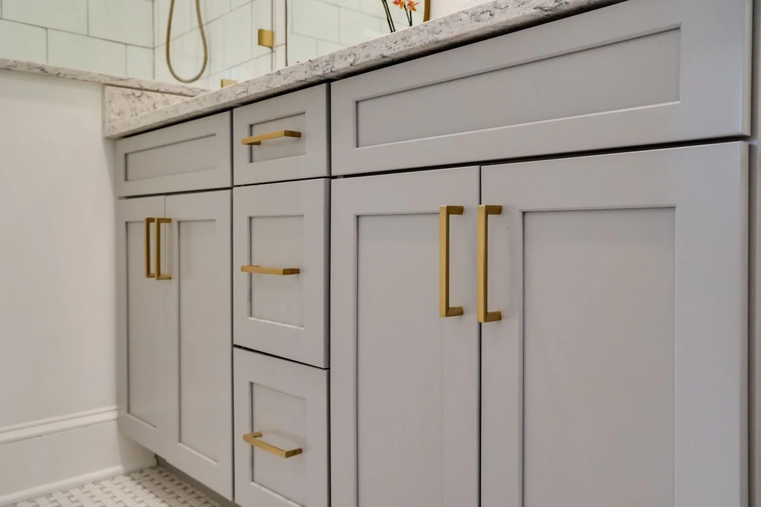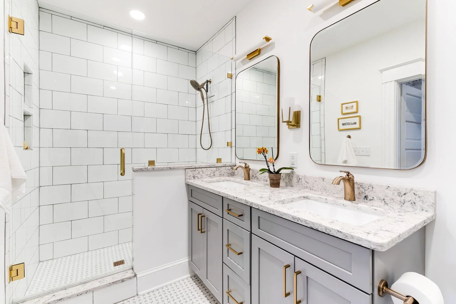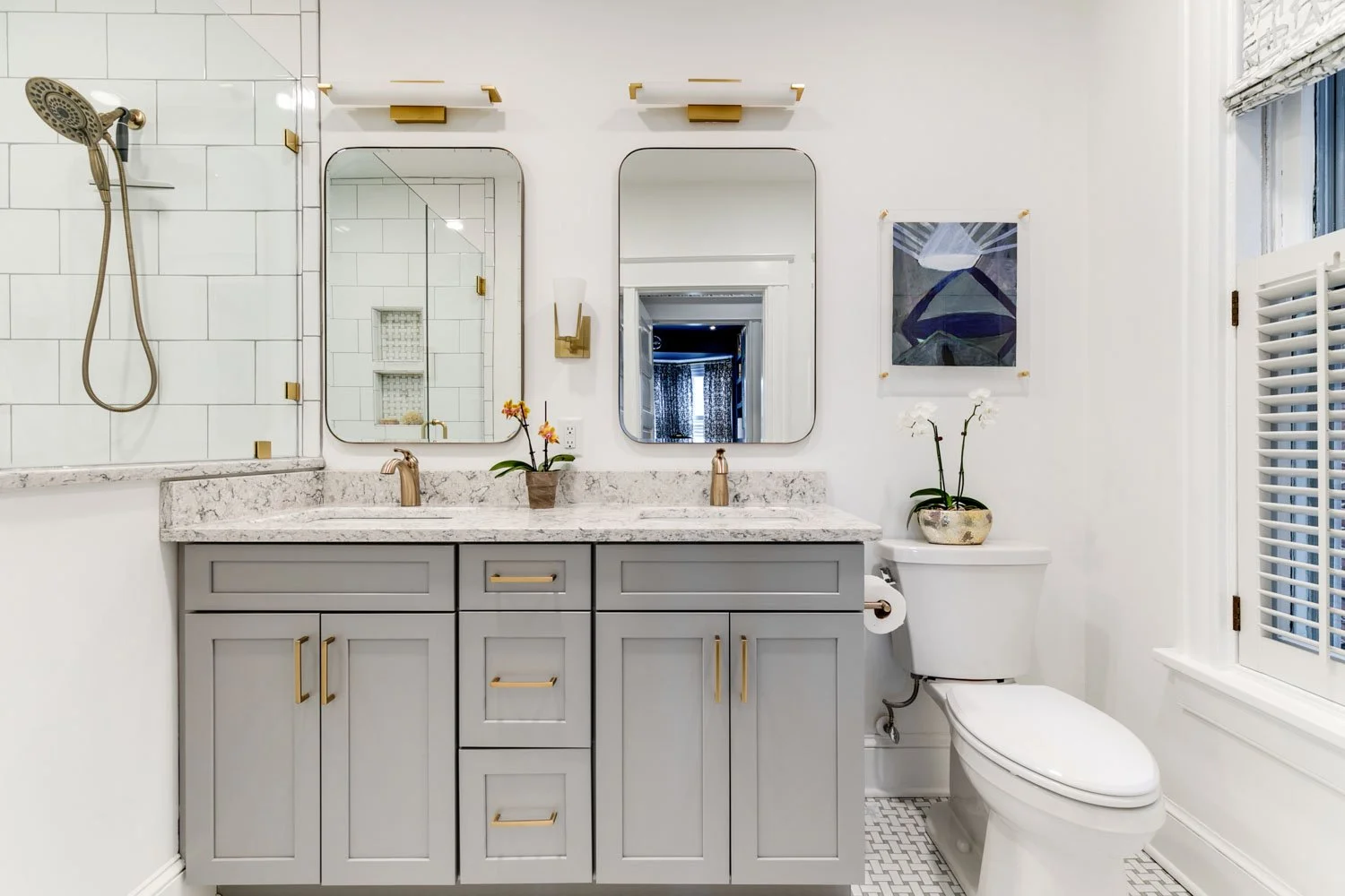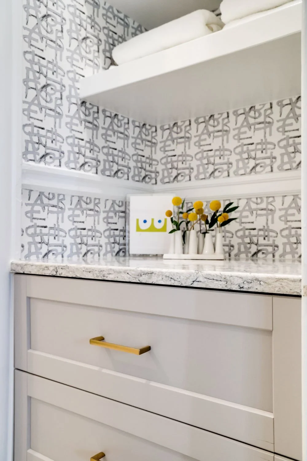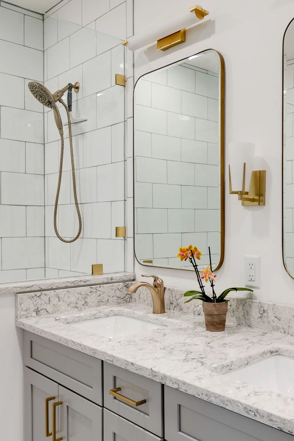 Additional space configurations were adjusted within the existing walls to accommodate his and her closet space and a large vanity and shower in the en suite. The homeowners artwork is featured on the drapery panels. The bathroom finishes are decidedly subdued with layers of lighting to meet the homeowner’s physical needs.