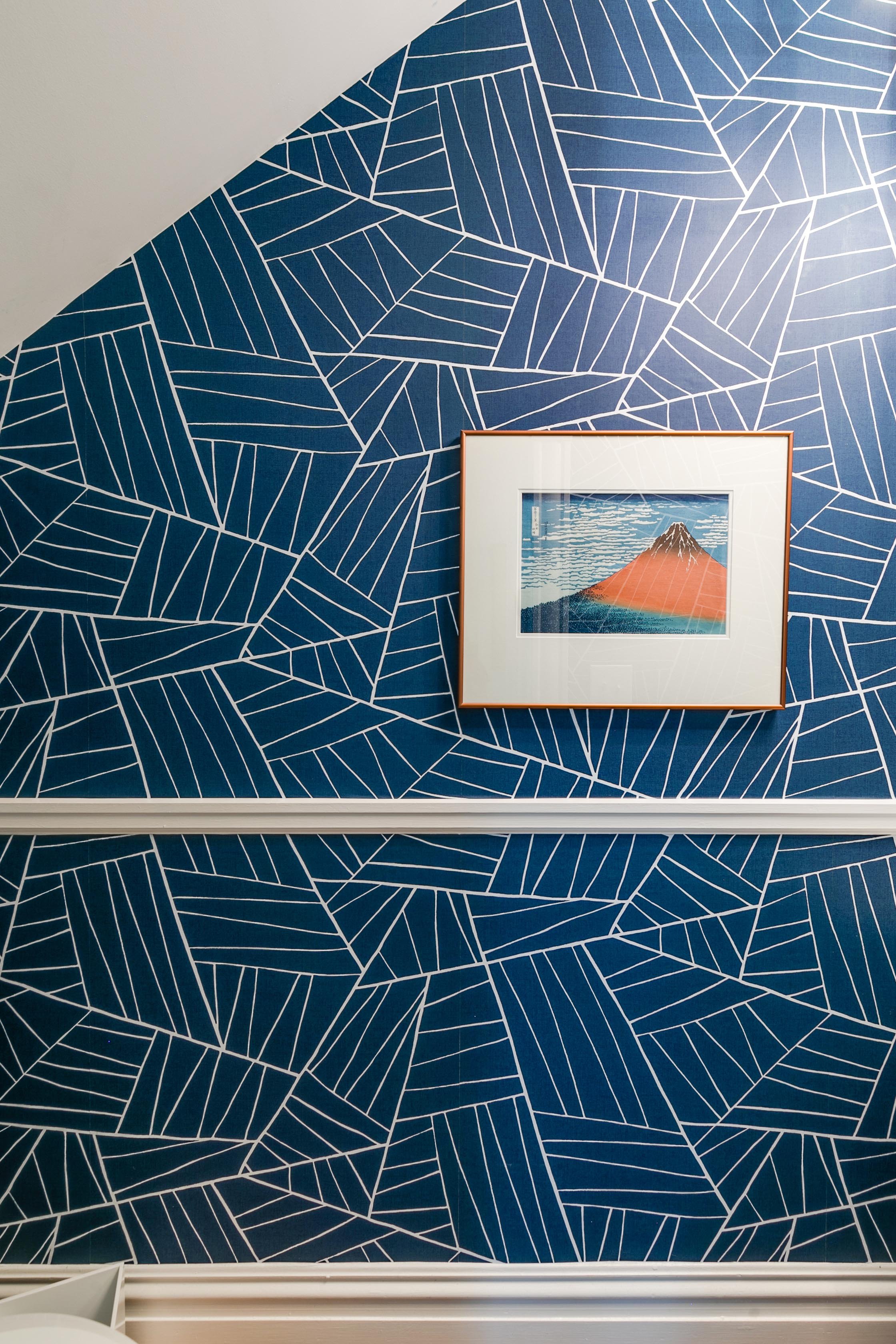 These homeowners were looking to move from their condo to a house in the Historic Fan District. They loved the neighborhood, but were not sure how their modern aesthetic would fit in a historical home. Without touching the architectural details, such as the fluted columns, we managed to design inviting entry, parlor and living room spaces with modern furnishings and a few traditional nods, such as the marble and iron coffee table. There are fun contemporary light fixtures throughout. The soft white walls help feature the extensive art collection. We went bold in the powder room with a graphic blue wallpaper and contemporary pendant to give the room a pop.