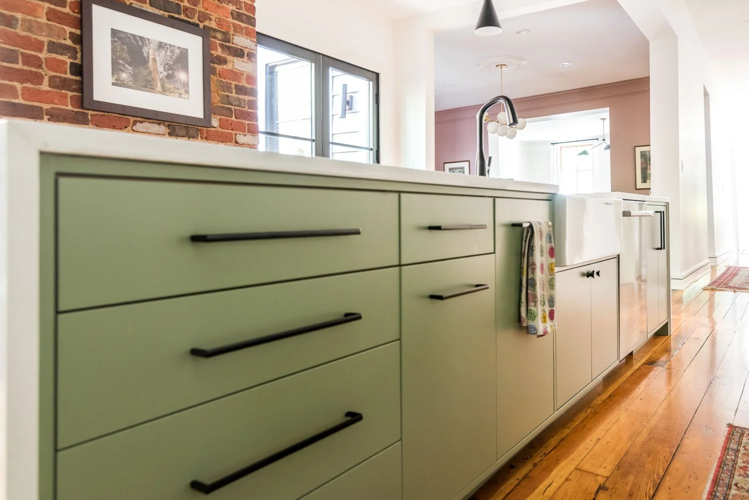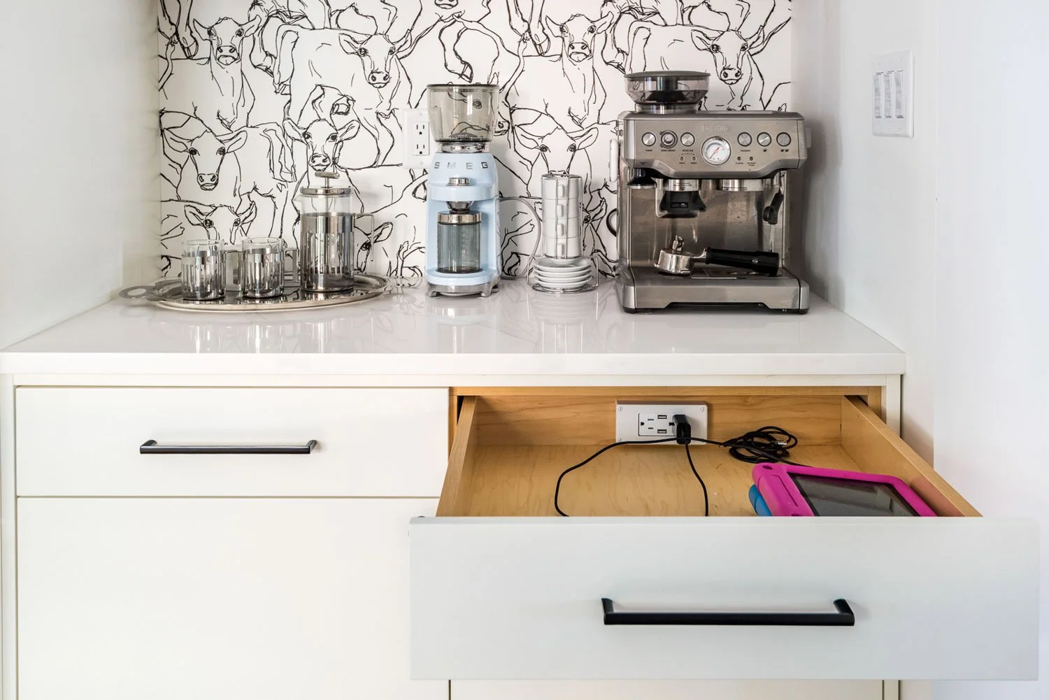 Working with the architect and builder to renovate this historic West Ave. home, we created a modern aesthetic in the back of the house. The kitchen opens up for more function and entertaining and both bathrooms were fully updated. Working with the couple, we helped select materials, finishes, paint and wallpaper to create a home to reflect their fun style and childhood memories with a nod to mid-century modern.