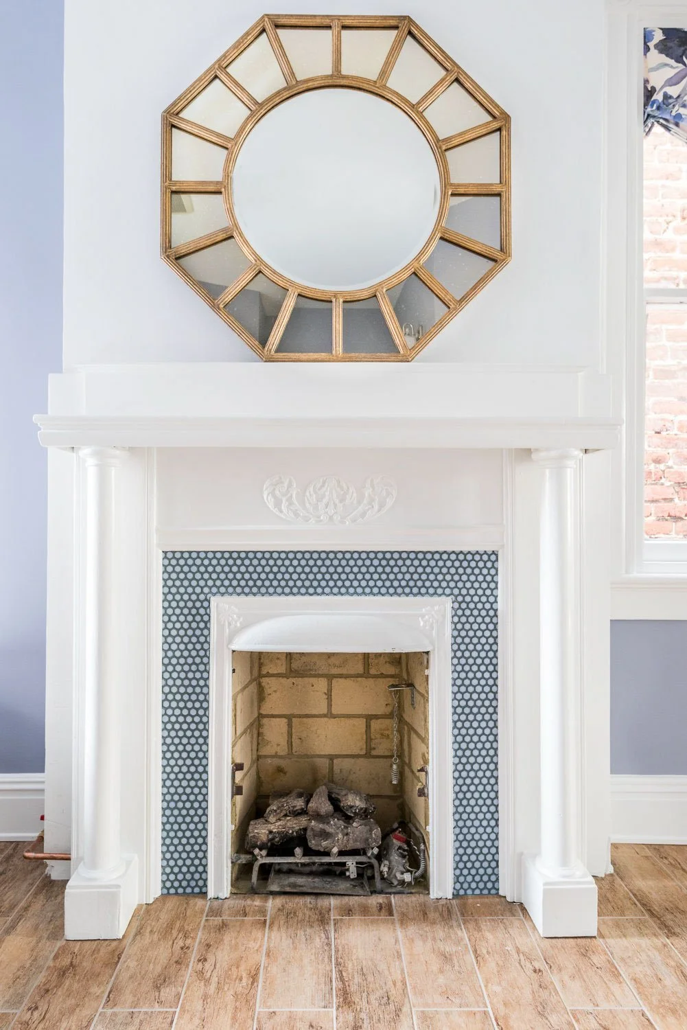 These newlyweds wanted a fun, but soothing bathroom. We used a wood plank tile on the floor, built a new shower and installed a gorgeous soaking tub. The fun fabric inspired the cornflower penny tile for the fireplace surround.